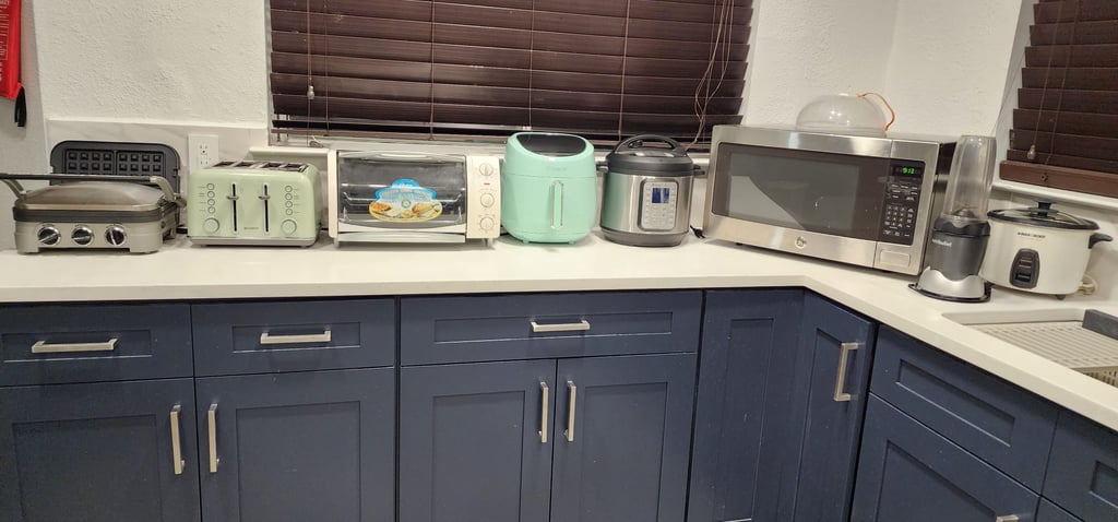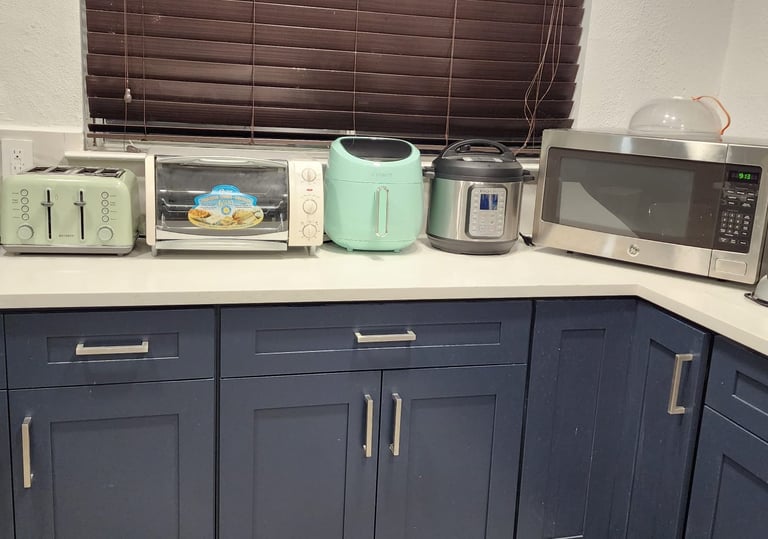 Kitchen full of small appliances for you to cook and save (Microwave, Air Fryer, Instant Pot & slow cooker, Rice Cooker, Toaster Oven, Toaster, Grill/Gridler, Egg cooker, Panini Press/ Sandwich Grill, and more)